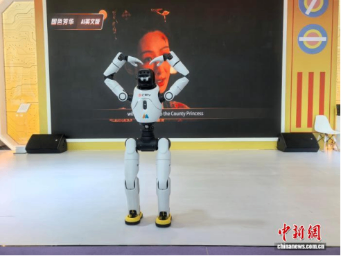 11月13日,2025中国新媒体技术展会现场,湖南广电展区的具身智能综艺合伙人“小玖”正在向观众“比心”。