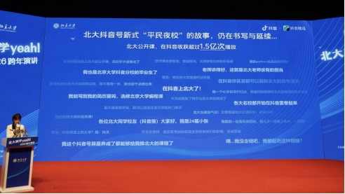 活动最后,抖音用户韩老师的登台分享引发了直播间评论区共鸣。作为一名小学教师,他因在抖音上偶然发现了一门北大公开课而踏入“云上燕园”,一个月内累计学习超24小时。在现场,他还特地感谢了参与公开课计划的北大老师们,“你们把知识无私地分享出来,让我们这些没有机会上北大的普通人,也能在网络上坐到北大的教室里。”